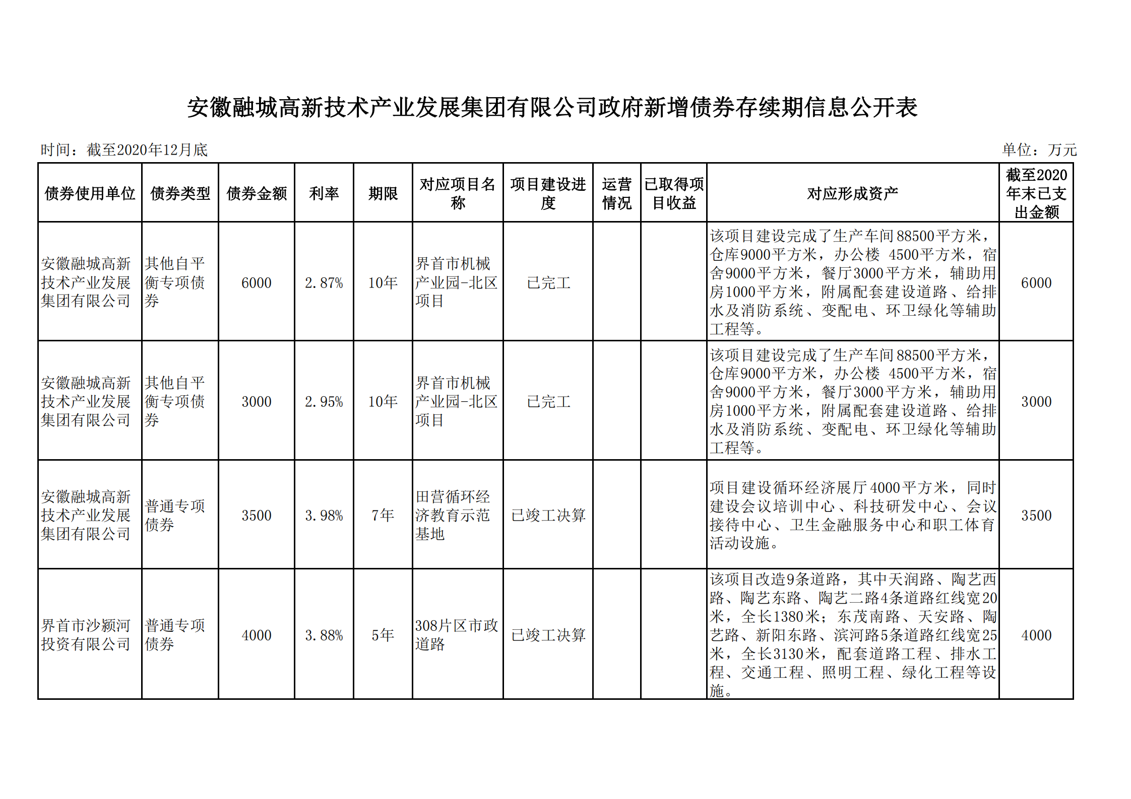 安徽融城高新技術(shù)產(chǎn)業(yè)發(fā)展集團(tuán)有限公司政府債券存續(xù)期信息公開表