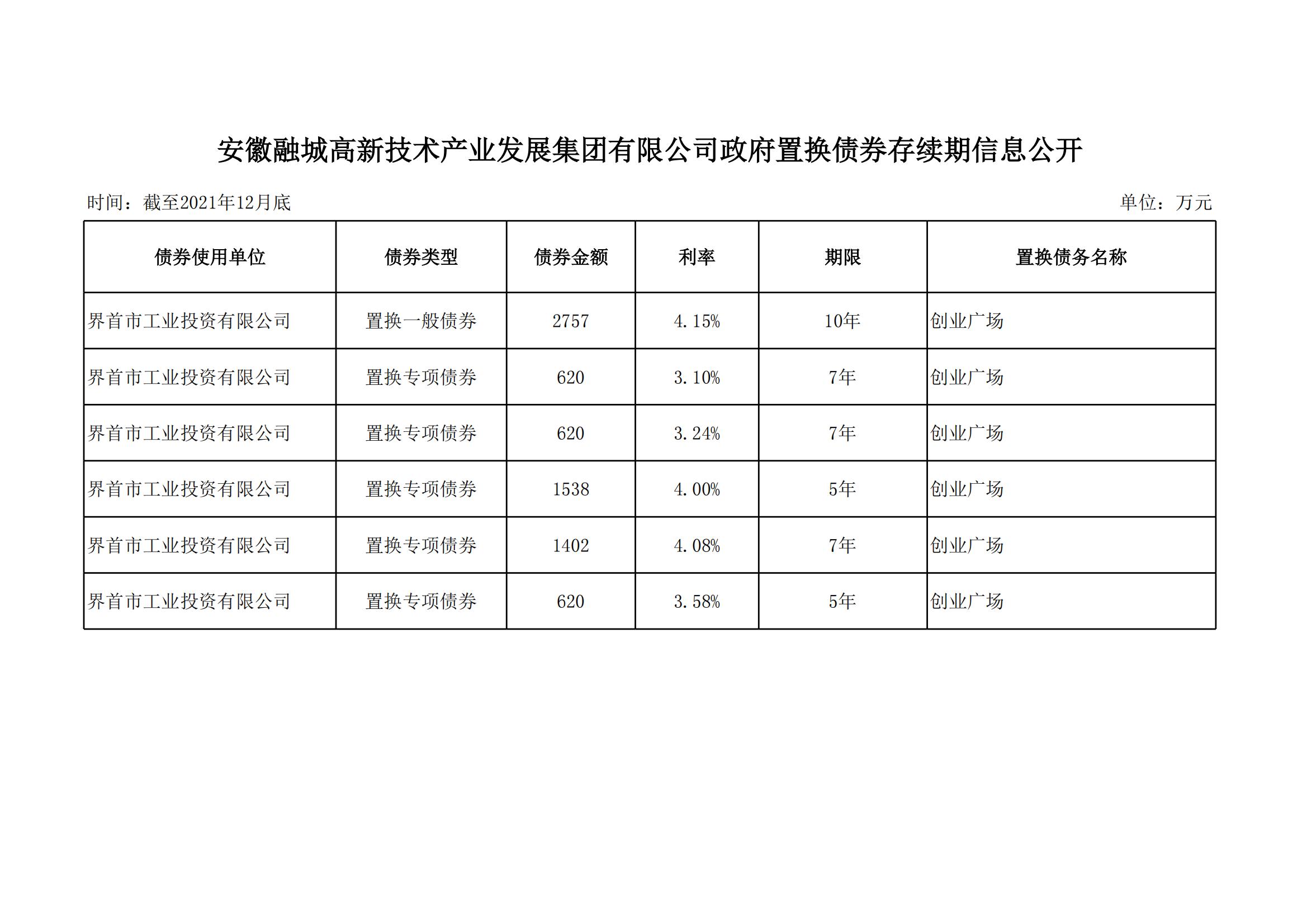 安徽融城高新技術(shù)產(chǎn)業(yè)發(fā)展集團(tuán)有限公司政府置換債券存續(xù)期信息公開