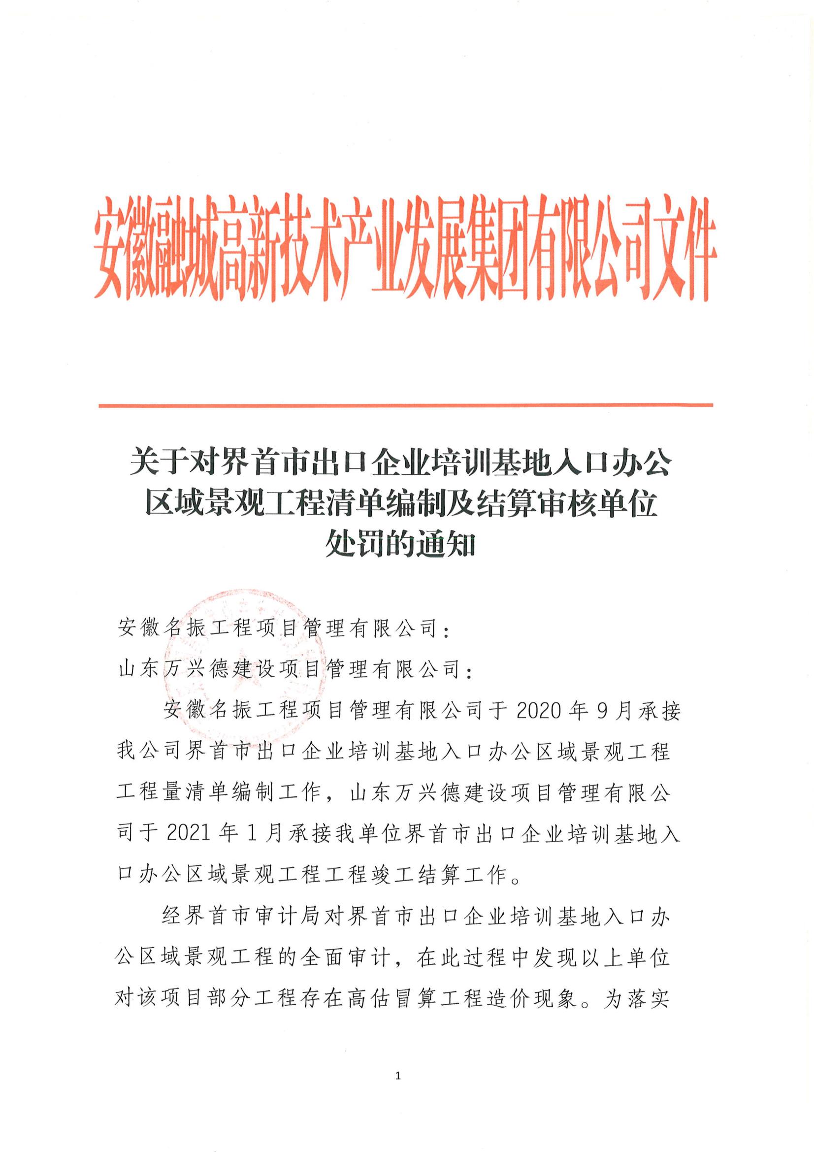 關(guān)于對(duì)界首市出口企業(yè)培訓(xùn)基地入口辦公區(qū)域景觀工程清單編制及結(jié)算審核單位 處罰的通知